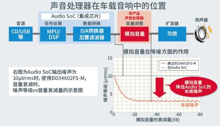 另一方面,音响用SoC*4) 作为车载音响的核心,随着制造工艺的微细化发展而呈现低电压趋势,可处理的音频信号变小,本底噪声相对增加。这个课题的解决方法要求在SoC的后段具备低噪声且高音质的模拟音量。