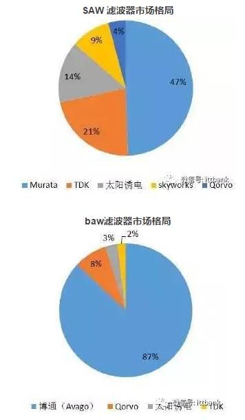 从全球范围来看,SAW 滤波器的主要供应商是TDK-EPCOS ,Murata和太阳诱电,三者合计超过八成的市场份额。BAW 滤波器的主要供应商是Avago 及Qorvo (Triquint),两者占有90%以上市场份额。例如,iPhone 7 就配备了2 颗大的滤波器组及2 颗滤波器,其中TDK 供应了2 颗滤波器组及一颗滤波器,而Murata 供应了另外1 颗滤波器。