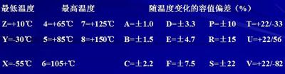 根据美国标准EIA-198-D,在用字母或数字表示陶瓷电容器的温度性质有三部分:第一部分为(例如字母X)最低工作温度;第二位部分有效数字为最高工作温度;第三部分为随温度变化的容差(以ppm/℃表示)。这三部分的字母与数字所表达的意义如表。