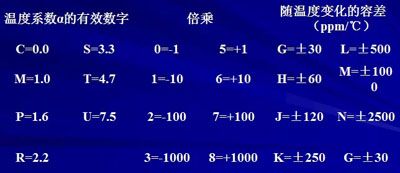 例如,C0G(有时也称为NP0)表示为:第一位字母C为温度系数的有效数字为0,第二位数字0为有效温度系数的倍乘为100=1,第三位字母G为随温度变化的容差为±30ppm/℃,即0±30ppm/℃;C0H分别表示为:第一位字母C为温度系数的有效数字为0,第二位数字0为有效温度系数的倍乘为100=1,第三位字母H为随温度变化的容差为±60ppm/℃,即0±60ppm/℃;S2H则分别表示为:第一位字母S为温度系数的有效数字为3.3,第二位数字2为有效温度系数的倍乘为102=100,第三位字母H为随温度变化的容差为±60ppm/℃,即-330±60ppm/℃