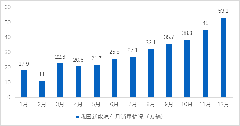 从2021年1月份起,新能源汽车月销量同比显著增长,且产销均刷新了当月历史记录,12月更是床下历史新高。2021年,新能源汽车产销分别完成354.49万辆和352.05万辆,同比分别增长159.49%和59.48%,增速较上年明显提升。
