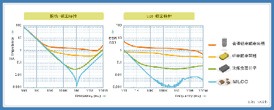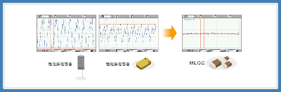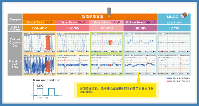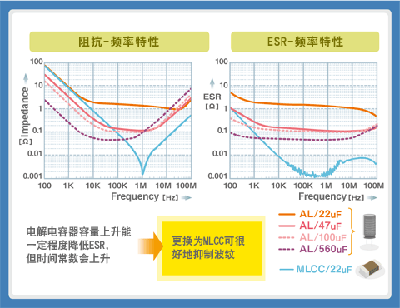 而在MLCC中,在较广的频率频带中ESR较低,因此不会产生以上问题,将电解电容器更换为MLCC后,可实现良好的波纹抑制效果。