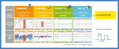 根据前述条件,对静電容量为22μF的普通铝电解电容器、钽电解电容器、功能性高分子铝电解电容器以及MLCC分别比较了输出电流与输出电压。