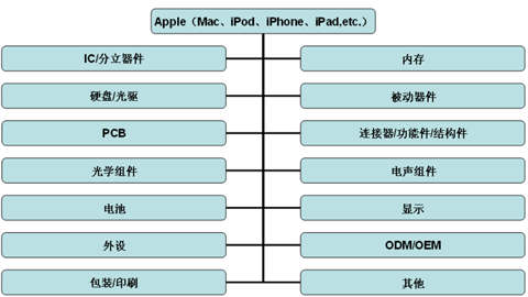 之前,Apple曾公布供应商名单,涵盖了材料、生产、代工等领域97%采购额共156家公司。这156家供应商分为IC/分立器件、内存、硬盘/光驱、被动器件等14个行业。这些厂商共同组成了Mac、iPod、iPhone、iPad等苹果产品线的供应体系。