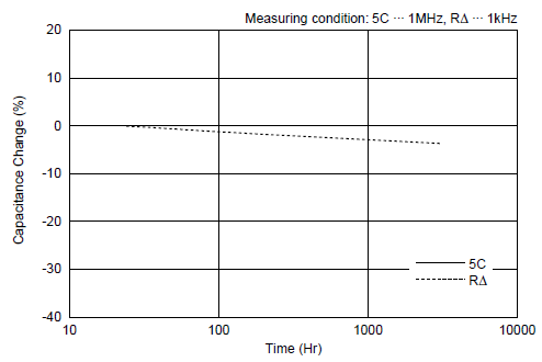 当在时钟电路等中使用时,应充分考虑此特性,并在实际使用条件及实际使用设备上进行确认。例如,如下图所示,静电容量随着时间延长而降低的特性称为静电容量的经时变化(老化)。经过的时间越长,其实效静电容量越低。(在对数时间图上基本呈直线线性降低)