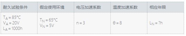 在此公式的基础上,通过在更为严苛的条件(更高温、更高电压)下进行加速试验,可推算出产品在实际使用环境下的使用寿命。