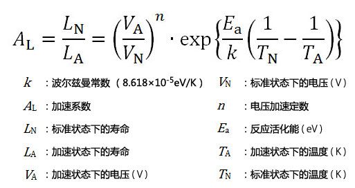 下面的加速公式是基于阿列纽斯法,利用电压加速系数(※1)及反应活化能(※2)推算。