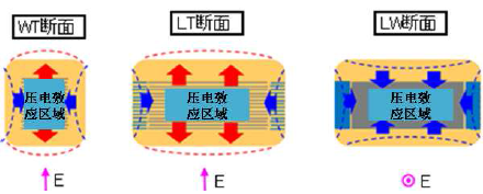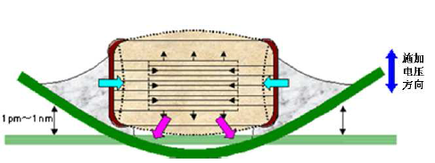 由于陶瓷的强介电性引起的压电效应,叠层电容在施加交流电之后会向叠层的方向发生伸缩。这是因为介电体一般的泊松比(横向变形系数)为0.3,如图2中所示,与叠层方向垂直的方向,即与电路板平行的方向也会发生伸缩,结果导致电路板表面产生振动并能够听到声音。电容器以及电路板的振幅仅为1pm~1nm,但振动声音已足够大到我们可以听见。单个电容器与空气产生的声阻抗有所差别,因此若仅是这样的话应该几乎是听不到啸叫的,然而焊接到电路板上之后,电路板成了声阻抗变压器,使振动频率达到人耳可分辨频段(20Hz~20kHz)时,就会听到类似“叽”的声音。