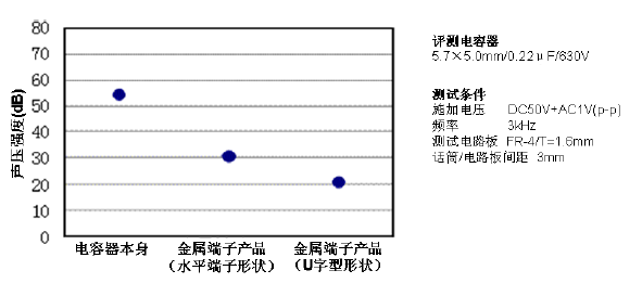 图5中显示了啸叫强度的比较数据。村田制作所拥有声压强度测定系统,用于安稳地测定安装有电容器的的啸叫强度,通过此系统可以对电容器的啸叫进行定量测试。针对单个电容器的啸叫,金属端子电容器能够大幅度的降低啸叫强度。另外,若与使用低介电率材料的陶瓷电容结合,能更进一步降低啸叫强度。